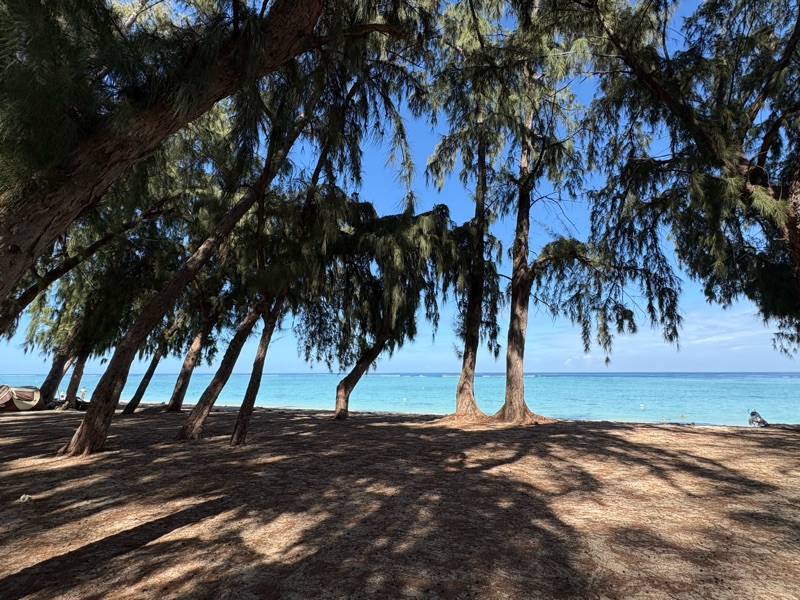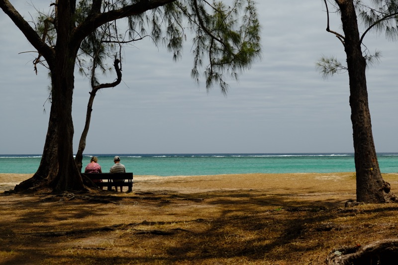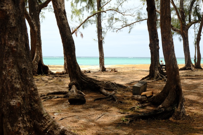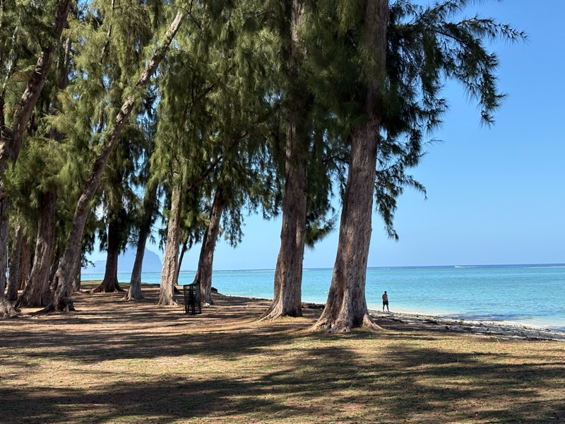Ostatnie dni spędziłam na robieniu nic, czyli na przesiadywaniu na plaży, obserwowaniu ludzi, czytaniu książki - w sumie nie do końca takie nic. Wyspa jest tak mała, że aby swobodnie ją sobie zwiedzać, nie jest konieczne nieustanne zmienienie miejsc noclegowych. Wystarczy jedno. Dla mnie to Flic en Flac z plażą ciągnącą się przez 3 km. Oczywiście ładniejsza część plaży z malowniczymi palmami, czyściutkim piaseczkiem, oczyszczonym z glonów, kamieni, martwych kawałków rafy i śmieci, znajduje się przy resortach, gdzie cena za dobę sięga 600 euro za dobę, a cień palm zarezerwowany jest dla gości. Plaża publiczna pozbawiona jest palm, są za to są jakieś drzewa iglaste, które wyglądają przepięknie, ale ich nazwy nie byłam w stanie ustalić. Ten las, plaża i morze w porannym świetle wyglądają naprawdę bajecznie.